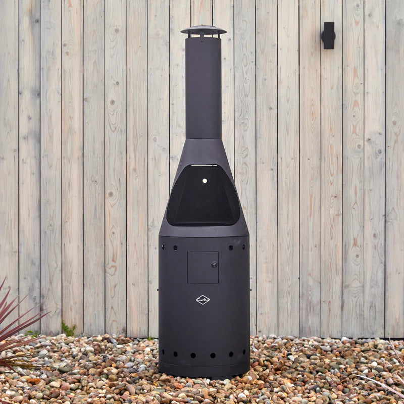 Designed to provide prolonged warmth well into the evening, its tall chimney directs smoke upwards, preventing eye irritation. This durable steel gas chiminea has exceptional functionality, featuring a rain cover for smoke dispersal and a steel body that retains and radiates heat.
