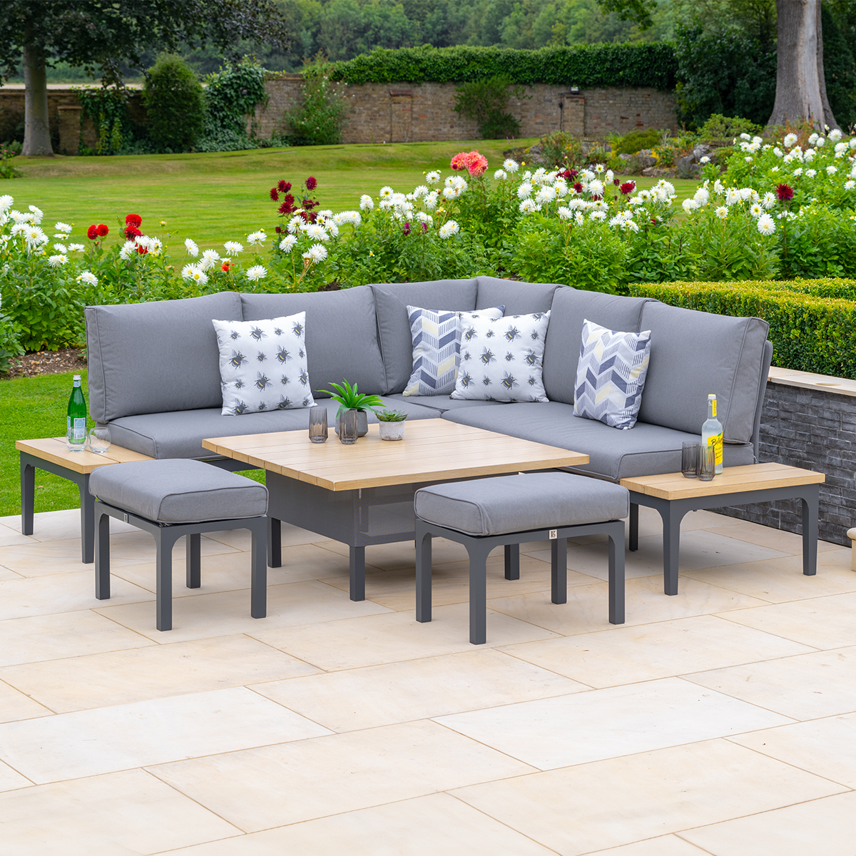 A sophisticated and modern addition to your outdoor space. With its light grey aluminum frames and light grey cushions, this open-sided modular dining set with adjustable table creates a welcoming environment where you can easily switch from coffee table conversation to dining table entertainment.